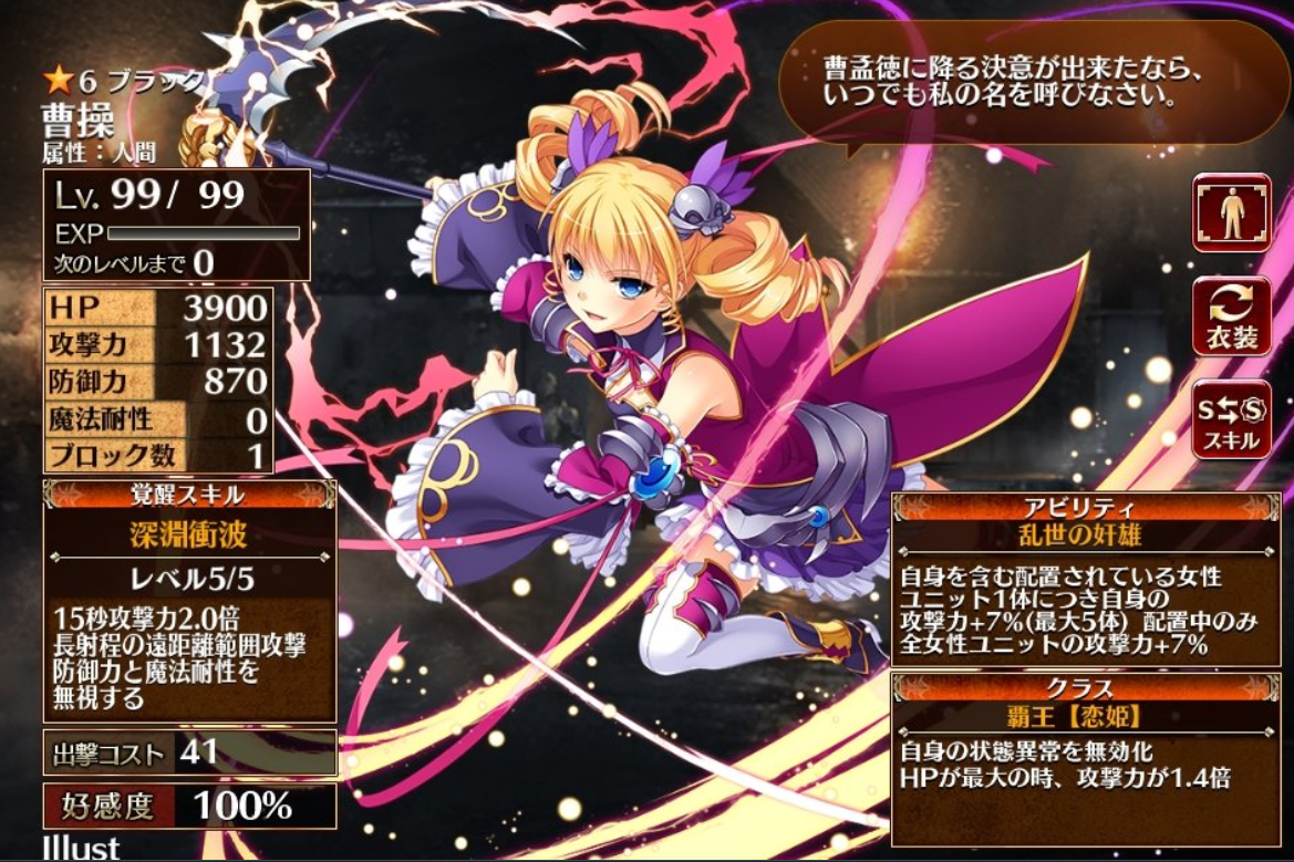 覚醒アビリティ「乱世の奸雄」・・・自身を含む配置されている女性ユニット1体に付き自身の攻撃力+7%(最大5体)。配置中のみ全女性ユニットの攻撃力+7%