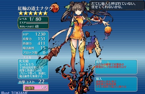 スキル「火尖槍」・・・15秒近接攻撃になり攻撃と防御が2.0倍。ブロック数+1、防御と魔法耐性を無視する